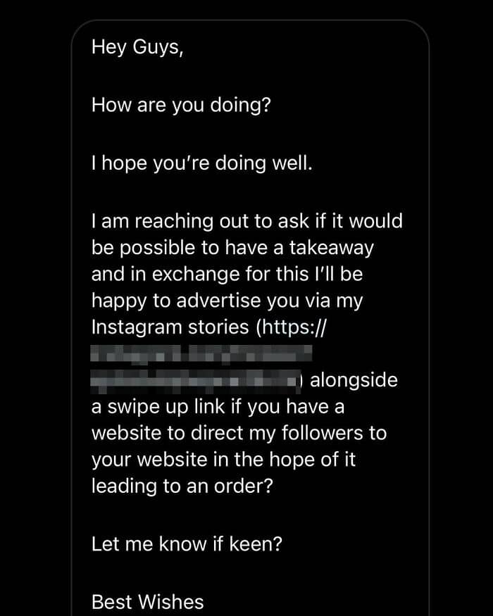 ‘Four Legs’ operates at a pub called The Compton Arms and they weren’t planning to stand for the influencer trying to score some freebies for their entire lockdown ‘bubble.’ Sure, a one-off free meal might sound all right in exchange for some advertising. But 5 whole meals? That’s just ridiculous!
