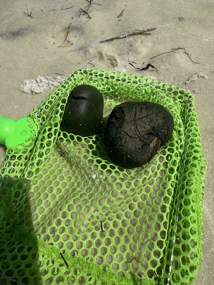 Tar balls! When I was a kid, my mom used to cover me in baby oil before we swam in the Gulf of Mexico so the tar didn’t stick to me.