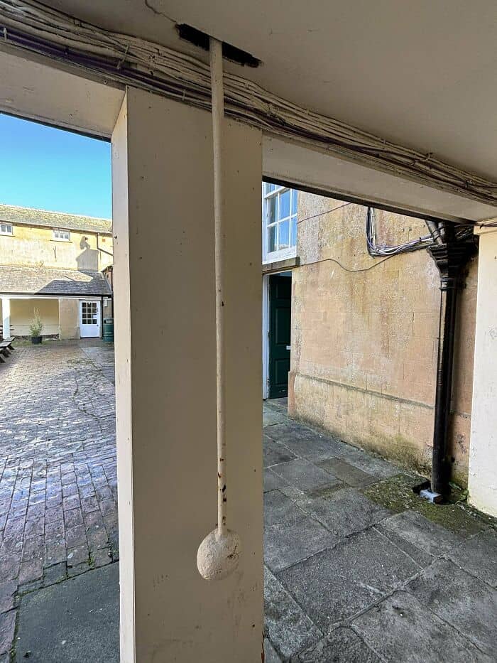 Its an old pump from a well. We have one with an actual old stand alone pumphouse in my town where i live. The one in your picture is built in to the building. The “pendulum” thing is for moving the pump mechanism to bring up the water from the well.