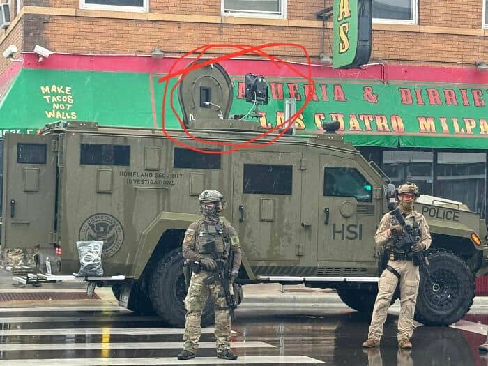 These are Long Range Acoustic Devices or LRADs. In particular, these are made by Genasys. The small black one looks like a LRAD 100 with a 2000 foot range and the larger ones are LRAD 450XL devices with over 5000 foot range. Highly advanced acoustic ‘speakers’ which can focus enough sound to tell you to ‘drop it’ or by turning up the volume, force you to by covering your ears.