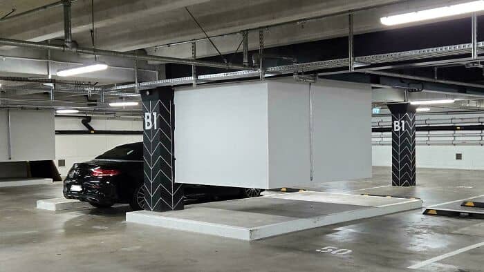 #57 Large White, Possibly Concrete, Box Shaped Section Hanging Above Concrete Pad In Basement Carpark Of Building, No Doors Or Access, Same On All Sides