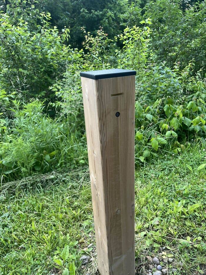 #80 Wooden Pole-Shaped Box With Divots And Screws Next To Scoring Pattern On Public Bike Trail
