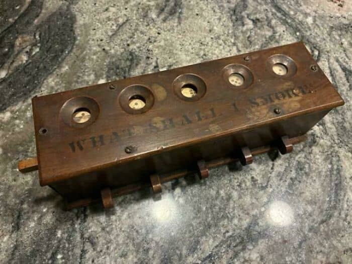 #88 Wooden Box With 6 Moving Levers And Spinning Dice Wheels, ~1ft Long, Says “What Shall I Smoke?” On It