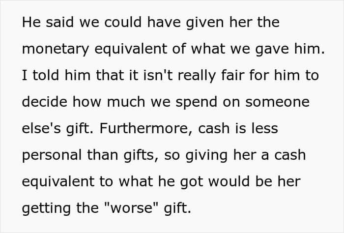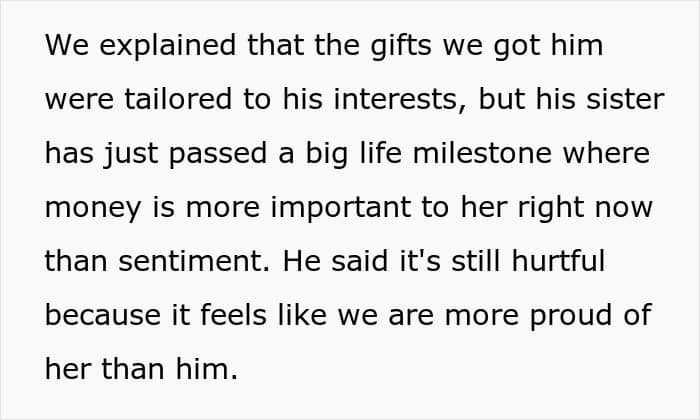 That being said, there were redditors who received a lot of support for saying that the parents are not at fault because they explained the reason in the disparity and it was logical assuming that they would do the same for their son when the occasion arose. Also, they found it weird that a 22 Y.O. would complain about this.
