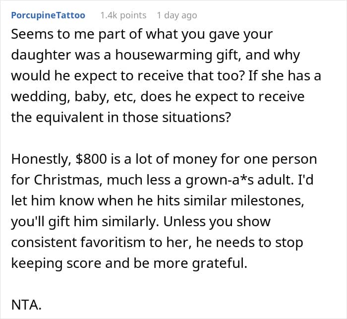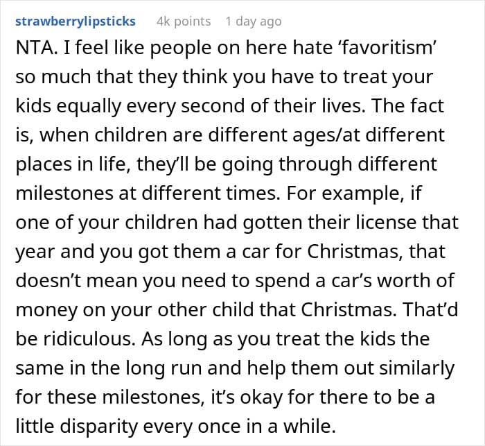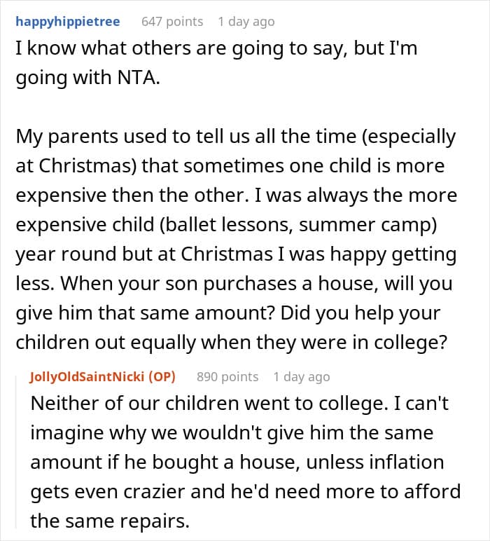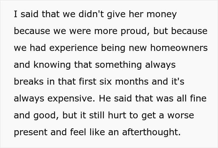 Second of all, there wasn’t anything wrong in giving the daughter money, because she has a house and it comes with unexpected expenses. But the timing was terrible. Redditors thought that the children’s Christmas gifts should have been of similar value and the rest of the money for the daughter could have been gifted at any time in the year. It shouldn’t have been framed as a Christmas gift at all.