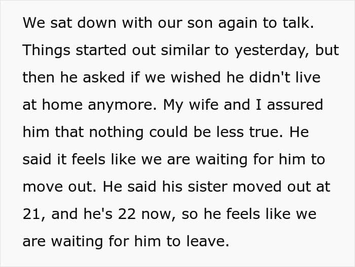 Turns out, the son felt unwelcome in his parents’ house and thought their unequal treatment of him was proof of that. He deduced that since his sister moved out at 21 years old, his parents expected him to do the same.