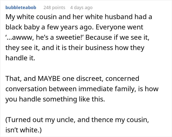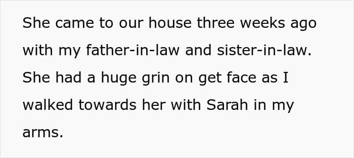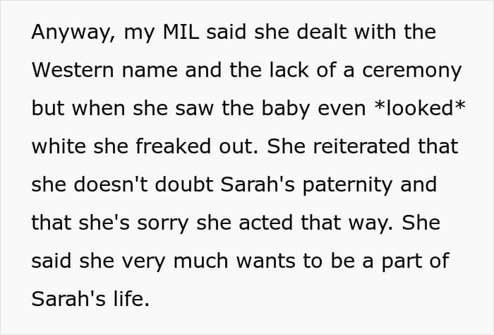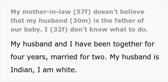 Instead of joy, she freaked out so badly that the baby burst into tears. Convinced the child couldn’t be her son’s because of its skin color, she shrieked accusations, ignored explanations, and stormed out before even holding the kid. For three painful weeks, she refused to see OP or the baby unless she agreed to a paternity test.