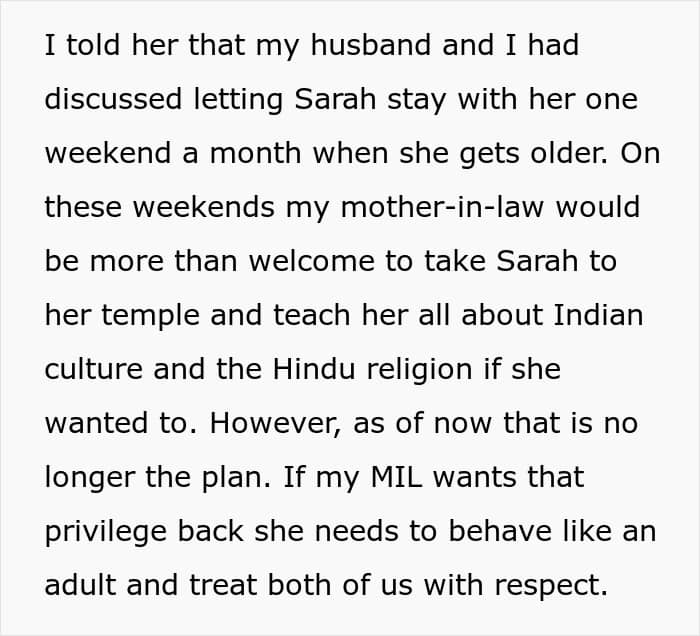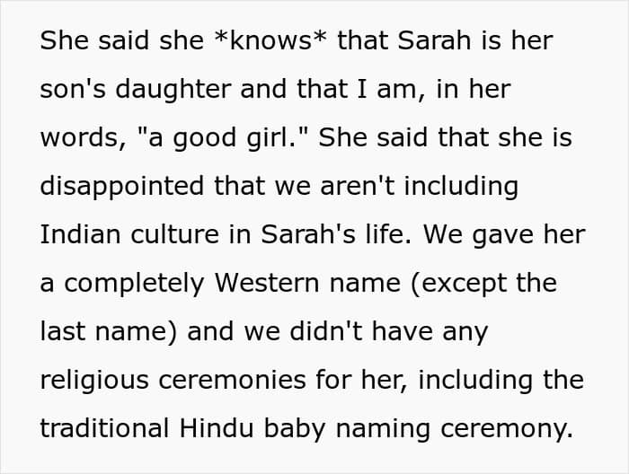 OP accepted her apology but set firm boundaries. No solo visits for now, and trust must be earned back. Still, she offered a bridge: someday, if all goes well, grandma can teach her granddaughter about Indian culture and even take her to her temple. By the end, there were hugs, tears, and a promise for a do-over, one careful, hopeful step at a time.