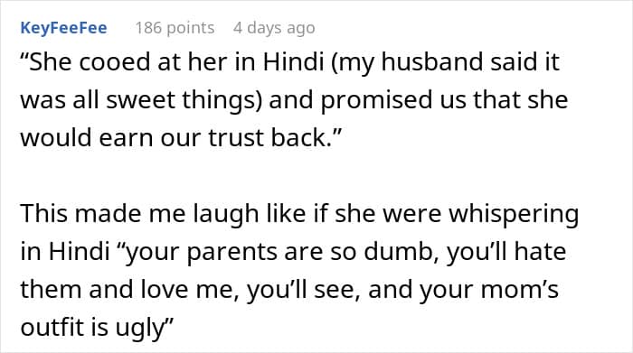 OP felt shaken. Her own family lives ten hours away, and she’d hoped her mother-in-law would be a constant loving presence. Instead, she got insults screamed in Hindi and a total meltdown over genetics. Unsure whether to swallow her pride or protect her peace, she wondered if trust could ever be rebuilt after such an explosive first impression.