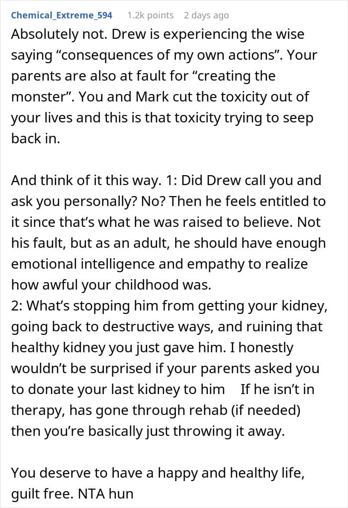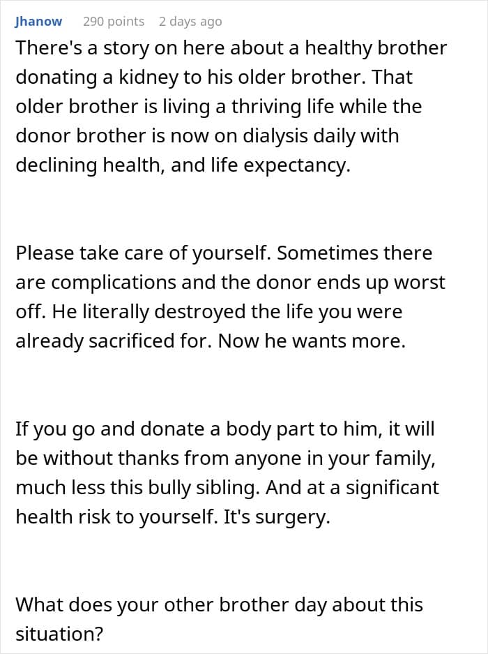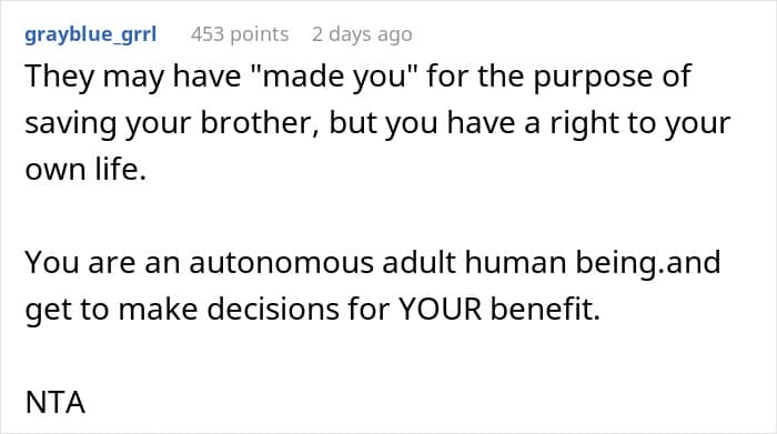 According to the responders, our heroine did the right thing by refusing to donate – after all, she had already suffered so much to ensure her brother was alive and well. Almost all commenters firmly believed the author has already given her bro everything she could, and now she owes nothing to anyone. So do you, our dear readers, also share this view?