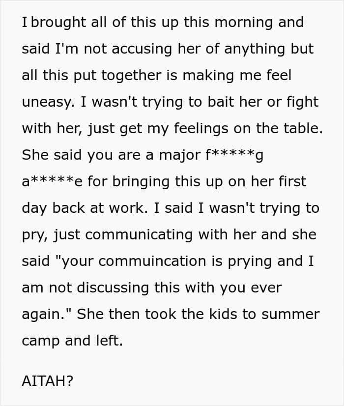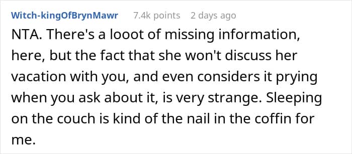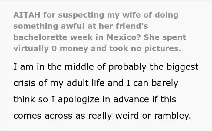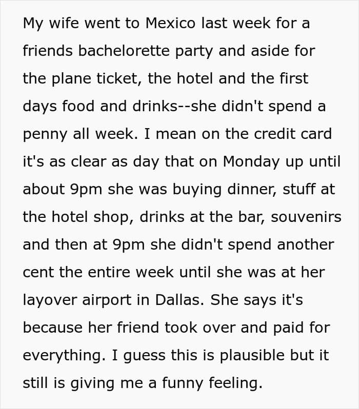 A man asked the internet what to do when his wife started to act suspiciously after returning from a week-long bachelorette trip in Mexico. He later shared a sizable update after doing some in-depth sleuthing. We reached out to the husband in the story via private message and will update the article when he gets back to us.