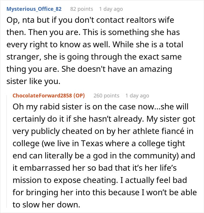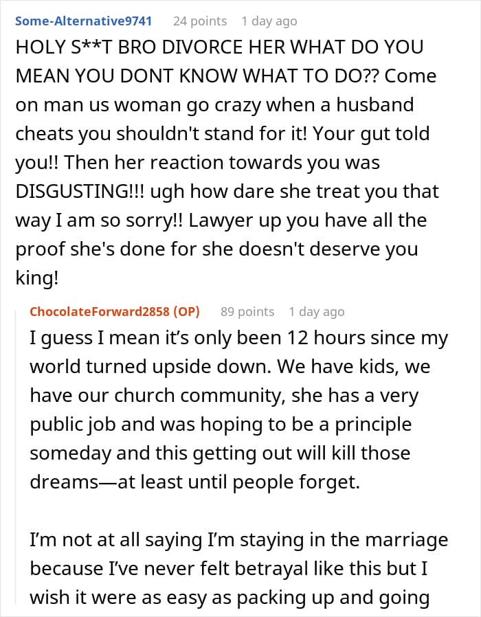 However, as stated in the update that you can find below, he is taking further steps. This is important because studies suggest that being proactive can help offset a lot of the depression and even PTSD that often arises from being the victim of infidelity. Filing for a divorce is often a good start. It’s also always helpful to have a real support system that can stand by you. Exposing them is also a perfectly valid strategy if one is looking for catharsis.