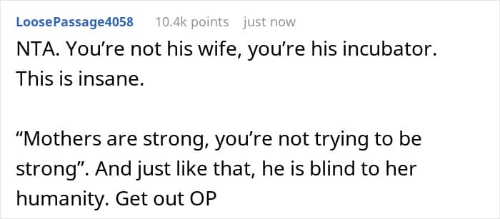Unfortunately, not all husbands, as it turns out, are capable of such support. Because some, as our story by the user u/Former_Monitor_4860 confirms, put their beliefs first, even at risk to the health of their wife and baby…