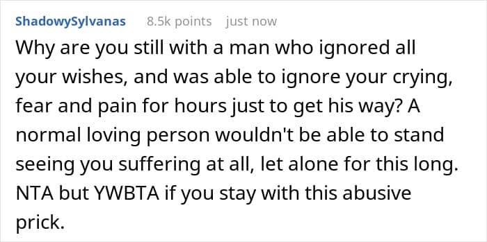 And people in the comments sincerely believe that the husband’s behavior effectively put an end to their marriage. “Why are you still with a man who ignored all your wishes, and was able to ignore your crying, fear and pain for hours just to get his way? A normal loving person wouldn’t be able to stand seeing you suffering at all, let alone for this long,” the commenter claimed. And do you, our dear readers, also agree with this point of view?