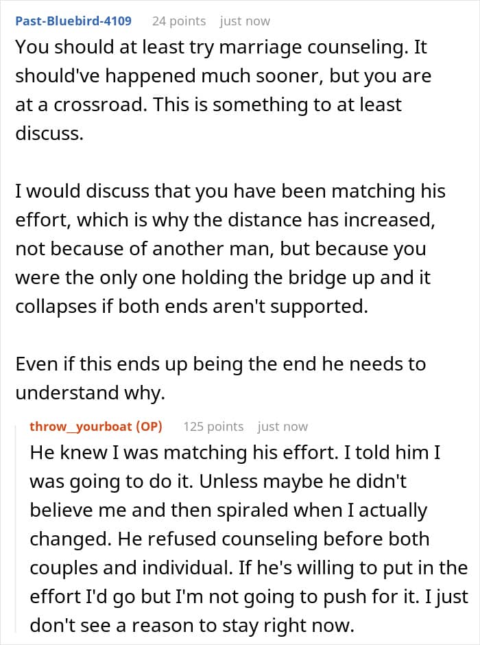One woman’s husband accused her of cheating after she started dialing back her affection and loving gestures because he wasn’t putting in any work. Now, considering they might be done, she’s turned to an online community to let off some steam.