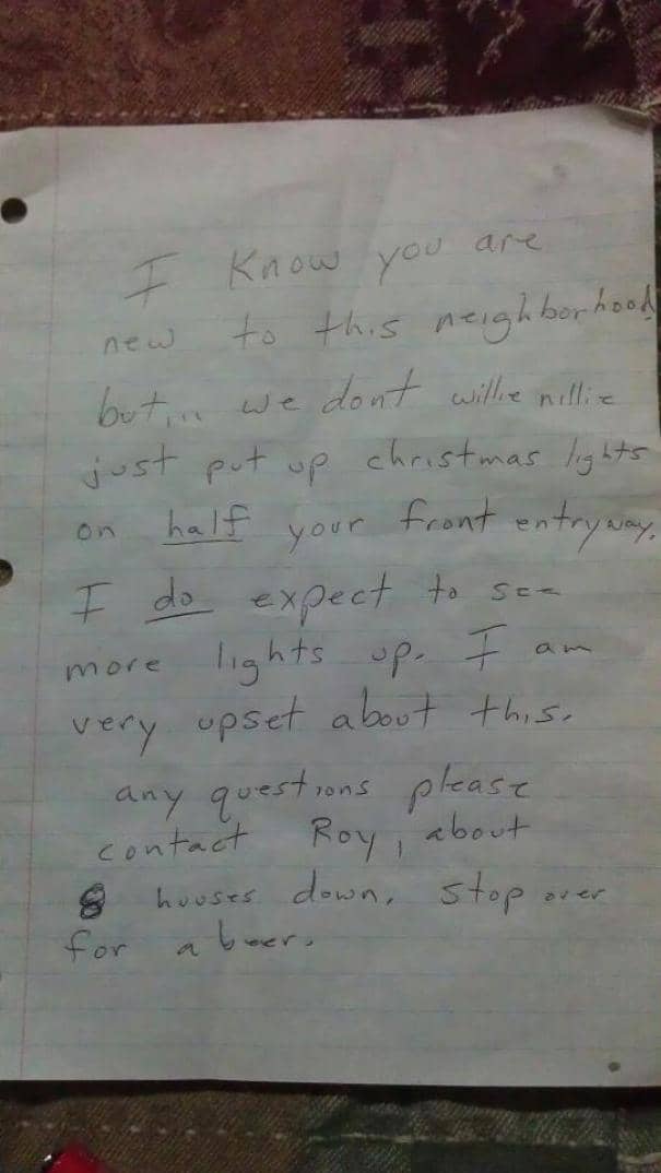 #104 My Friend Had Half Of His Christmas Lights Up. This Was On His Door The Next Day
