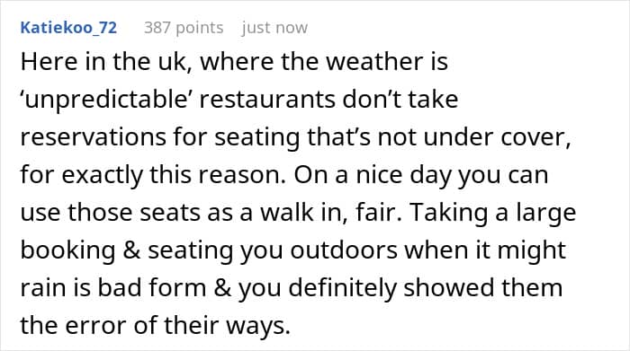 The woman refused and people in the comments thought that the restaurant deserved bigger consequences for their attitude and customer service, because how can you reserve a table outside when you can’t control the weather, which we know they are aware of?