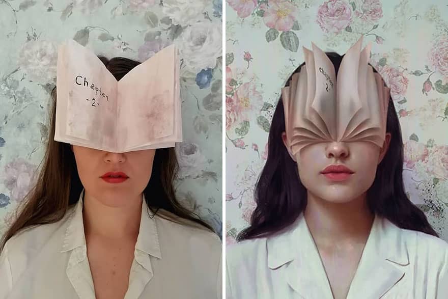 I do everything on my own: makeup, costumes, lighting with a table lamp, and shooting just with my phone’s camera, using very simple things which surround me at home.