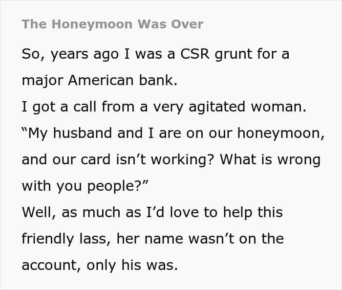 Money is nice. While you have it. Run out, and everything can spiral into chaos. In a Reddit post shared by Kilowatt128f, the customer support representative for a major American bank recounted a particularly intense conversation with a couple on their honeymoon. The newlyweds’ credit card had stopped working, and frustration quickly boiled over. The wife called in for help, but her name wasn’t on the account, forcing her husband to step in and verify. However, what soon unraveled probably ended their trip quicker than planned.